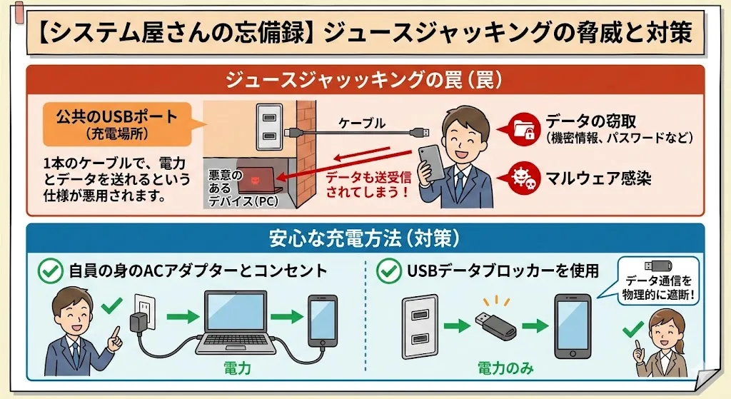 ジュースジャッキングは、手口自体は古くからあるものの、USBポートが街中に溢れている現代だからこそ、ふとした瞬間に被害に遭いやすい攻撃です。